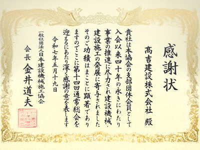 弊社は、令和7年5月19日 一般社団法人日本建設機械施行協会 第14回東北支部通常総会において、「本部会長感謝状」を受領しました。
